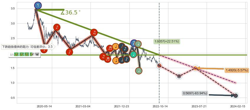 ♘ 在最后的下跌阶段2020-01-09至2022-04-14,存在 持续未破位的阻力位 ,阻力价格1.9357,可信任强度81.13%,其距离最后价格1.5800相差 +22.51%