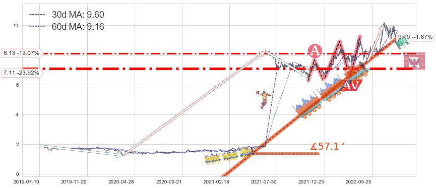 ♘ 支撑价格位7.11,可信任强度87.08%,距离最后交易2022-08-12形成的收盘价格9.35相差 -23.92%