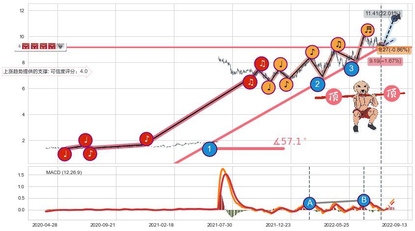♘ 支撑价格位8.13,可信任强度63.43%,距离最后交易2022-08-12形成的收盘价格9.35相差 -13.07%
