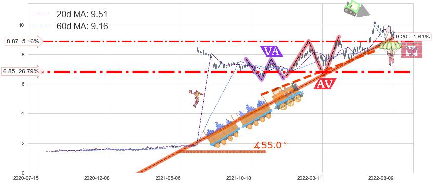 ♘ 支撑价格位6.85,可信任强度88.32%,距离最后交易2022-08-12形成的收盘价格9.35相差 -26.79%