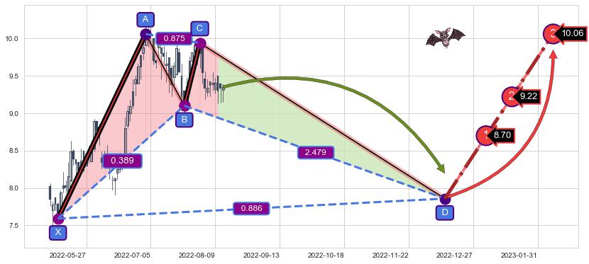 ➣ 未完成【蝙蝠】形态起点X: 2022-05-12, 已到达C点: 2022-08-01, 预测最终D点: 2022-12-12, 共149交易日