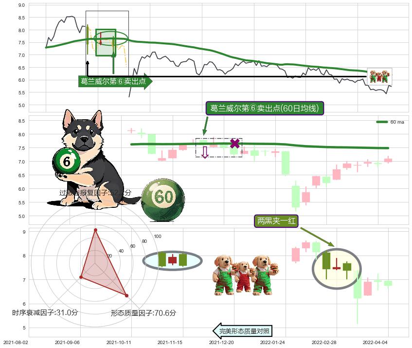 | 2 🅚:下跌两颗星 | 下跌三颗星 ➕ 🎢:葛兰威尔第⑧卖出点卖出点信号形成后,猜想后续持续下行(趋势跟踪) ☞ 看空信号 ⇥ 【均线】交织【🅚线】⇥ 综合量化分数: 46 | > |