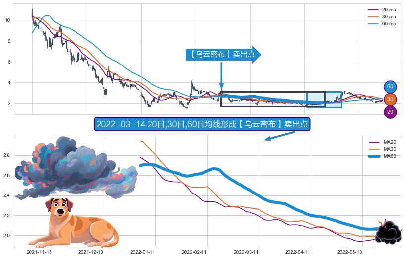 ⚀ 2022-01-03日-2022-05-25日显现 20日-30日-60日均线 【乌云密布】卖出点 看空信号,后市看跌,卖出