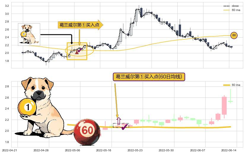 ⚀ 2022-05-17-日显现 葛兰威尔均线 60日均线 第买①入点 走势反转见底信号,后市看涨,买进信号