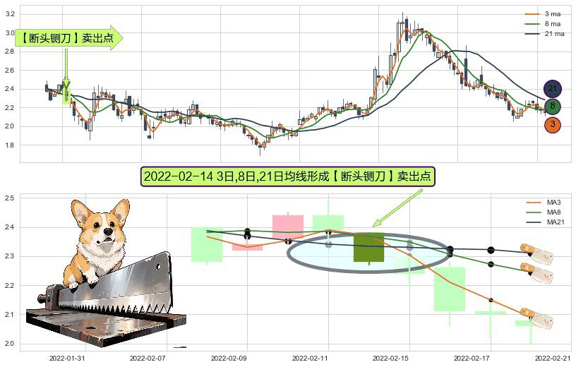 ⚀ 2022-02-14日显现 3日-8日-21日均线 【断头铡刀】卖出点 看空信号,后市看跌,卖出