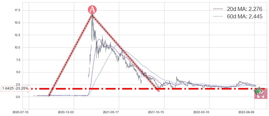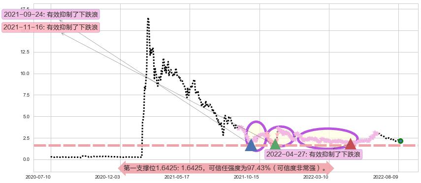 ♘ 支撑价格位1.6425,可信任强度97.43%,距离最后交易2022-08-12形成的收盘价格2.140相差 -23.25%