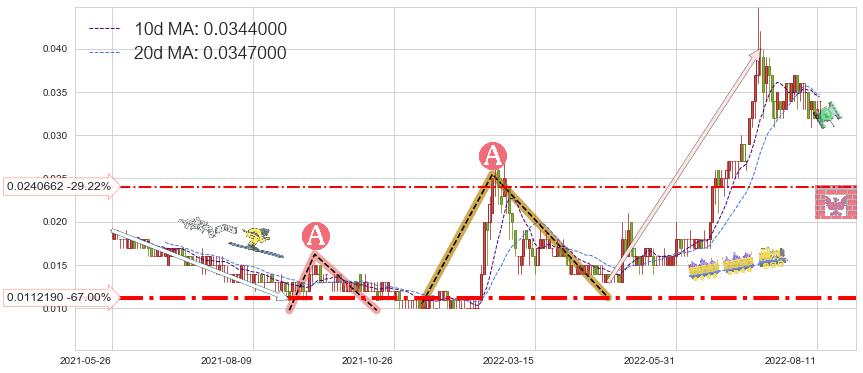 ♘ 支撑价格位0.0112190,可信任强度83.73%,距离最后交易2022-08-12形成的收盘价格0.0340000相差 -67.00%