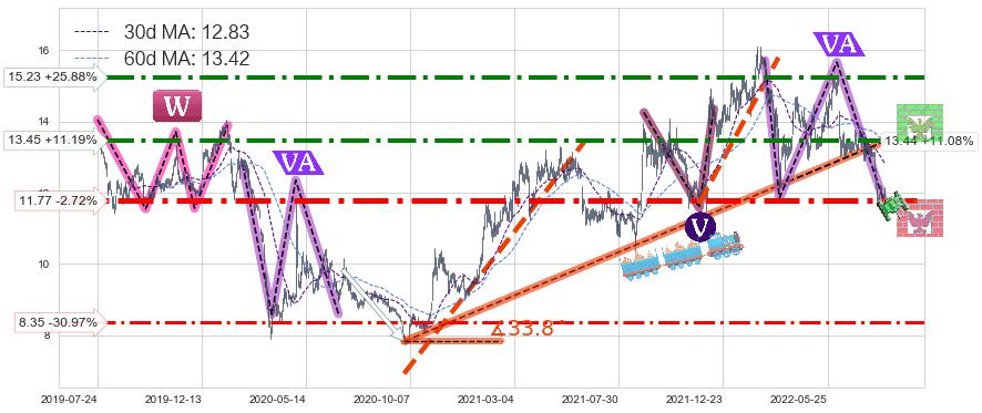 ♘ 阻力价格位13.45,可信任强度82.09%,距离最后交易2022-08-12形成的收盘价格12.10相差 +11.19%