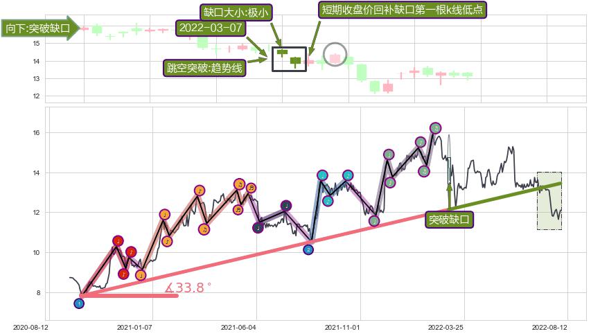 ✂️ 2020-09-25-2022-03-04上升趋势存在反转[风险],其原上升趋势的支撑位(13.44)已破位[强阻力信号],原上升趋势角度: 33.8˚