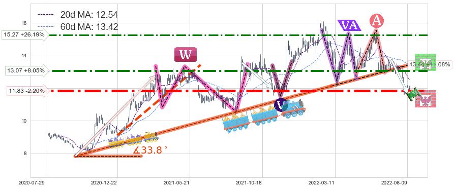 ♘ 阻力价格位13.07,可信任强度74.44%,距离最后交易2022-08-12形成的收盘价格12.10相差 +8.05%