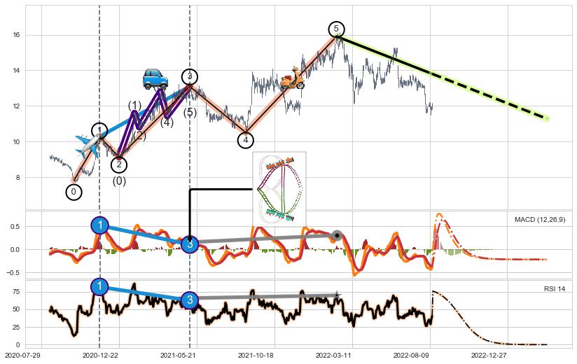 ➣ 第一, 三, 五浪上涨动能逐渐【衰弱变小】,趋势呈现不稳迹象