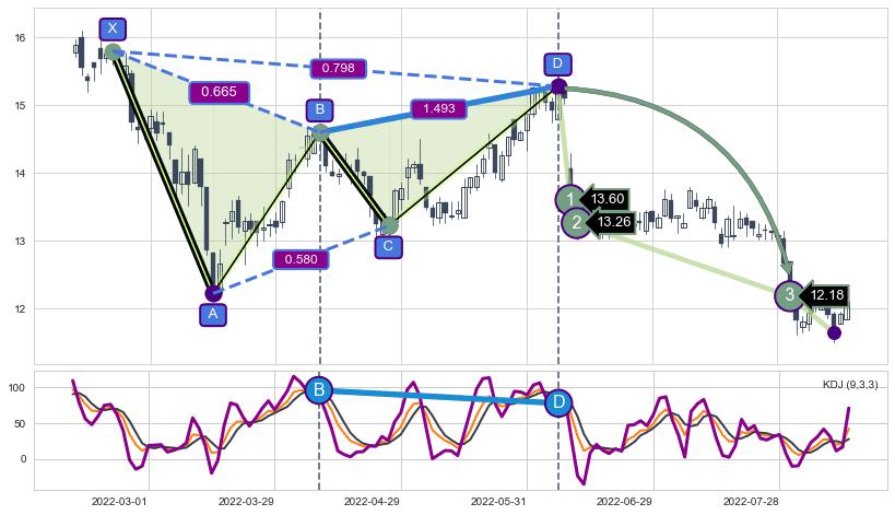 ➢ 谐波价格D点比B点高 ⤴,【KDJ】指标D点比B点低 ⤵️