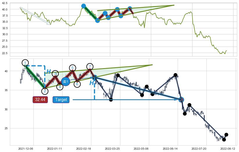 ➢ 最小中继整理跌幅→𝐇: 5.85 (𝐇楔型旗杆的长度:楔型起点→顶点)