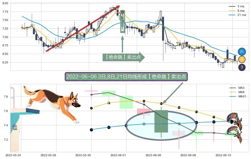 形态多维评估: ⚀ 2022-06-06日显现 3日-8日-21日均线 【绝命跳】卖出点 看空信号,后市看跌,卖出