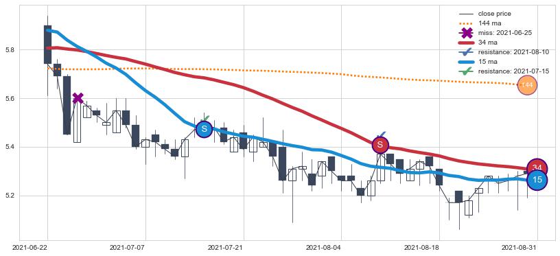 下跌趋势2021-06-22-2021-08-31,均线34, 15确认关键阻力2处