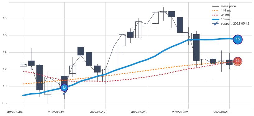 上涨趋势2022-05-04-2022-06-13,均线15确认关键支撑1处