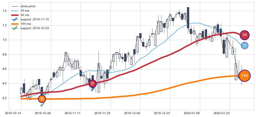 上涨趋势2019-10-14-2020-01-31,均线144, 34确认关键支撑2处