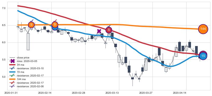 下跌趋势2020-01-31-2020-04-20,均线144, 34, 15确认关键阻力3处
