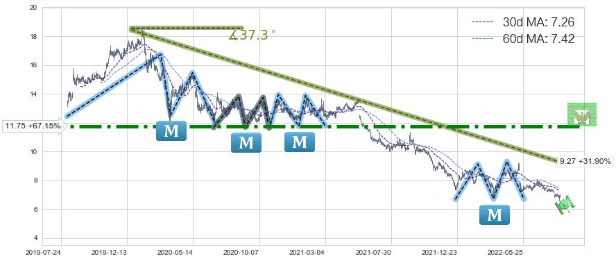 ♘ 阻力价格位11.75,可信任强度97.09%,距离最后交易2022-08-12形成的收盘价格7.03相差 +67.15%