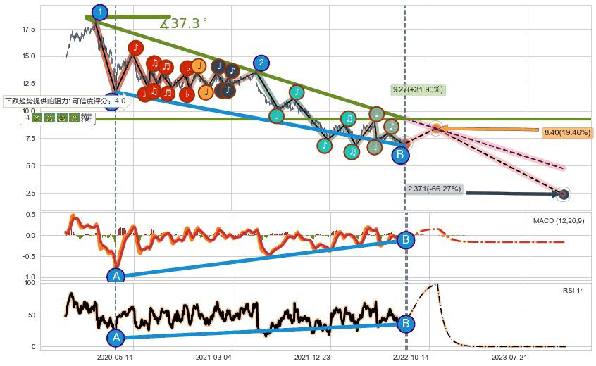 ♘ 在最后的下跌阶段2019-12-23至2022-08-12,存在 持续未破位的阻力位 ,阻力价格9.27,可信任强度85.37%,其距离最后价格7.03相差 +31.90%