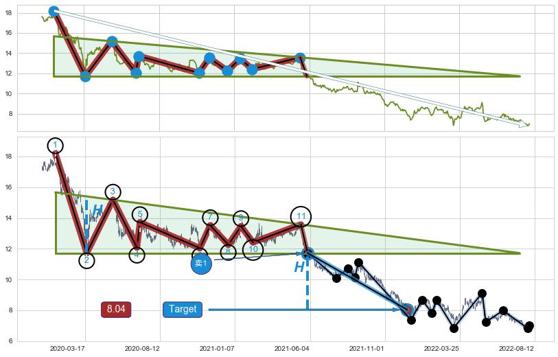 ➢ 【多方力量耗尽,空方打破攻守平衡点】下降三角形中继整理, 已在2021-06-01突破【支撑】颈线 11.72 →演变成下降通道