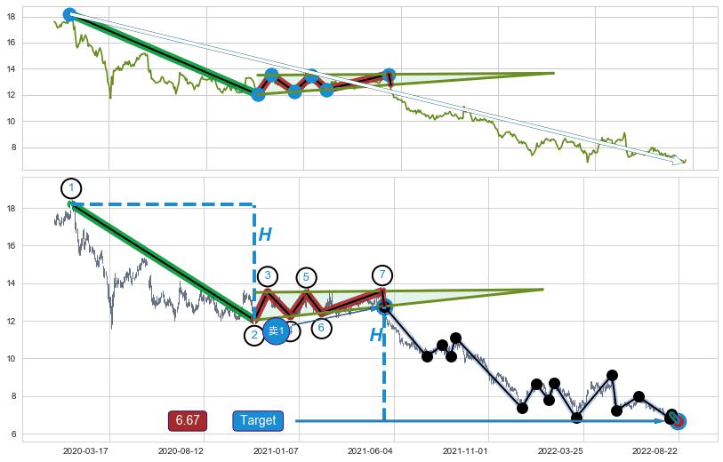 ➢ 最小中继整理跌幅→𝐇: 6.10 (𝐇楔型旗杆的长度:楔型起点→顶点)