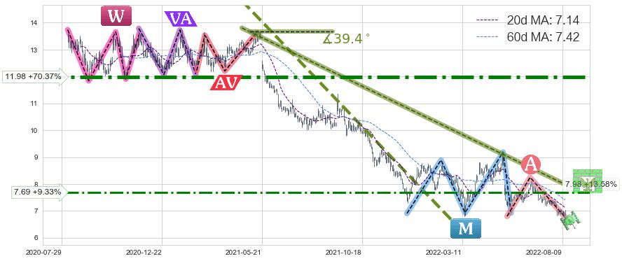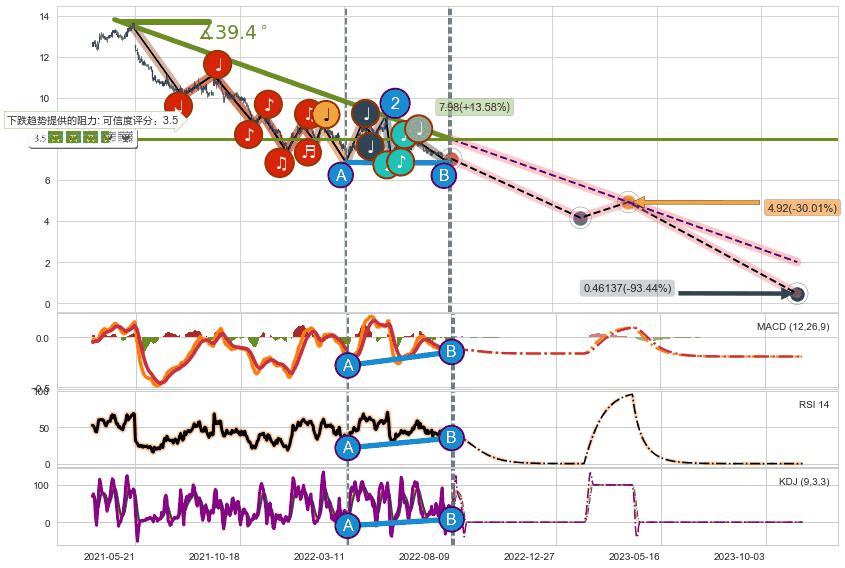 ♘ 阻力价格位7.69,可信任强度59.17%,距离最后交易2022-08-12形成的收盘价格7.03相差 +9.33%