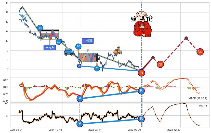 ➣ 【中枢B】:2021-12-24-2022-02-10,中枢由4笔构成,共31交易日, ZG=8.67, ZD=7.84