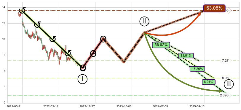 ➣ 5.1: 预测当前第5浪位置(2022-08-10, 6.82),仍然有下跌空间