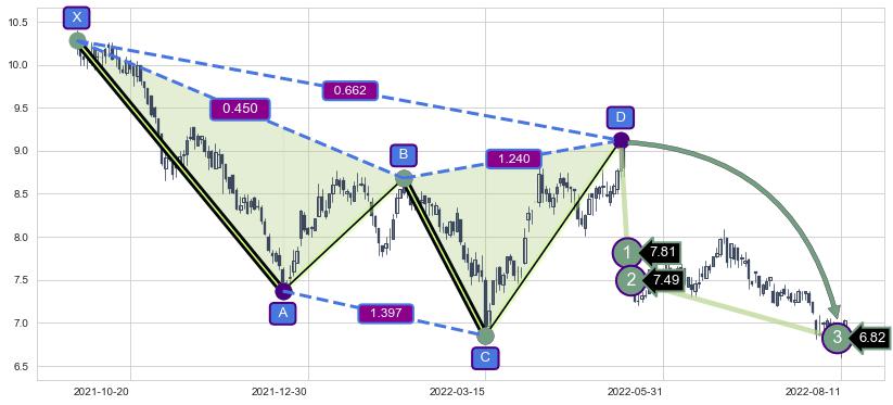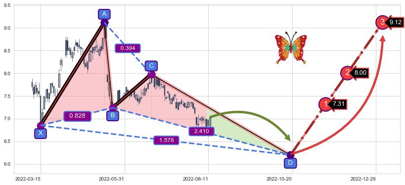 ➣ 未完成【蝴蝶】形态起点X: 2022-03-15, 已到达C点: 2022-06-23, 预测最终D点: 2022-10-19, 共148交易日