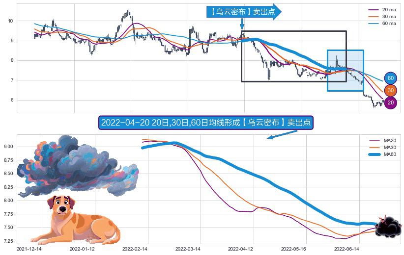 ⚃ 【乌云密布】卖出点长时间对 牛 市转 熊 市进行确认,且均线压制价格走势,但信号发出时间较长,属于【迟滞】看空卖出信号