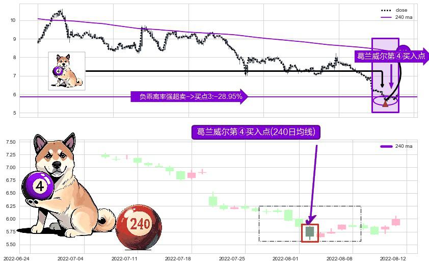 形态多维评估: ⚀ 2022-08-02-日显现 葛兰威尔均线 240日均线 第④买入点 下降趋势均值回复的短线反弹信号,后市看涨,买进信号