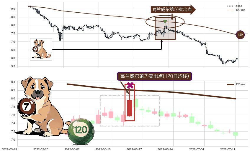 形态多维评估: ⚀ 2022-06-15-日显现 葛兰威尔均线 120日均线 第⑦卖出点 下降趋势的中继信号,后市看跌,卖出信号