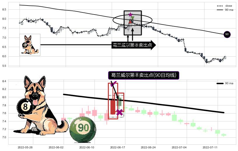 形态多维评估: ⚀ 2022-06-16-日显现 葛兰威尔均线 90日均线 第⑧卖出点 下降趋势的中继信号,后市看跌,卖出信号