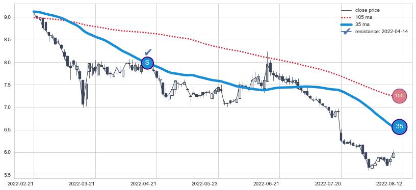 下跌趋势2022-02-21-2022-08-12,均线35确认关键阻力1处