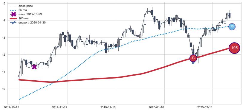 上涨趋势2019-10-15-2020-02-20,均线105确认关键支撑1处