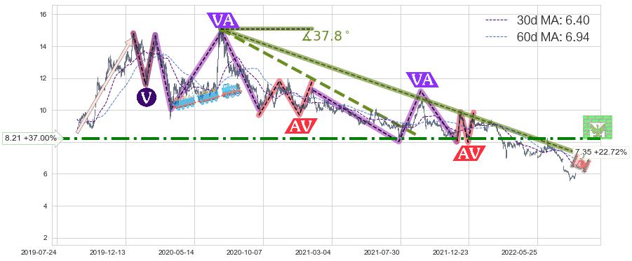 ➢ 【多方力量耗尽,空方打破攻守平衡点】下降三角形中继整理, 已在2022-03-07突破【支撑】颈线 8.30 →演变成下降通道