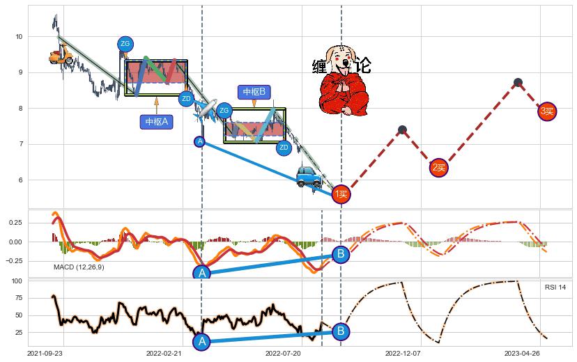 ➢ 【中枢B】:2022-04-26-2022-06-15,中枢由4笔构成,共34交易日, ZG=7.59, ZD=7.22