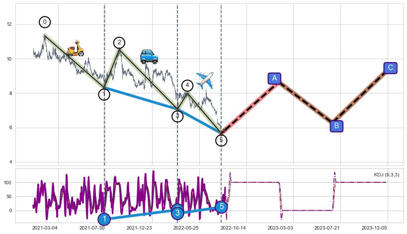 | 4 🅚:【高山滑雪】买入点 ➕ 🌊:波浪理论猜想下跌浪5已形成,猜想后续形成abc反弹上涨(均值回复) ☞ 看多信号 ⇥ 【均线】交织【图形】⇥ 综合量化分数: 52 | > |