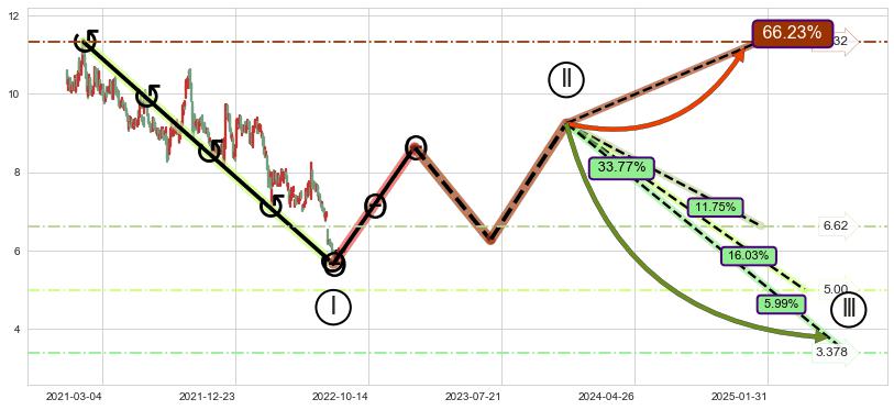 ➢ 循环浪继续向下【最高】位置(2025-01-17, 6.62),匹配聚类样本比例34.79%, 可能性概率11.75%