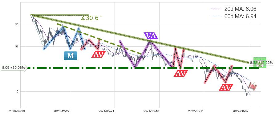 ♞ 20日均线:6.06,60日均线:6.94→ 快线<慢线