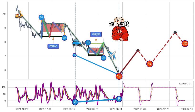 ➢ 【中枢A】:2021-11-29-2022-02-10,中枢由6笔构成,共50交易日, ZG=9.33, ZD=8.71
