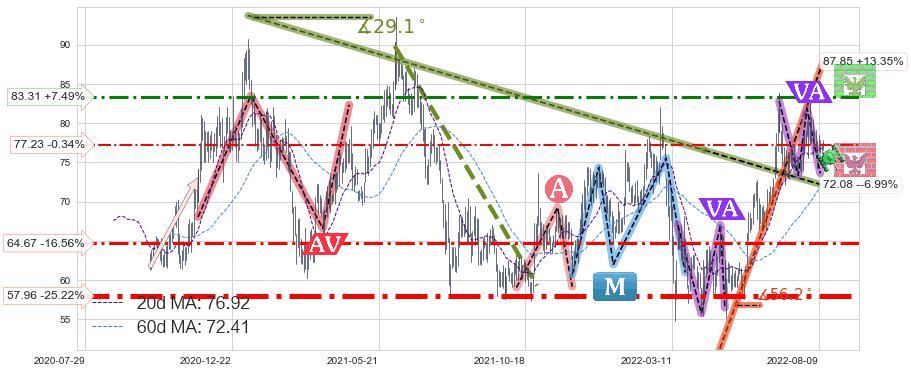 ♘ 支撑价格位77.23,可信任强度38.12%,距离最后交易2022-08-12形成的收盘价格77.50相差 -0.34%