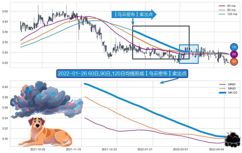 ⚀ 2021-11-23日-2022-04-11日显现 60日-90日-120日均线 【乌云密布】卖出点 看空信号,后市看跌,卖出