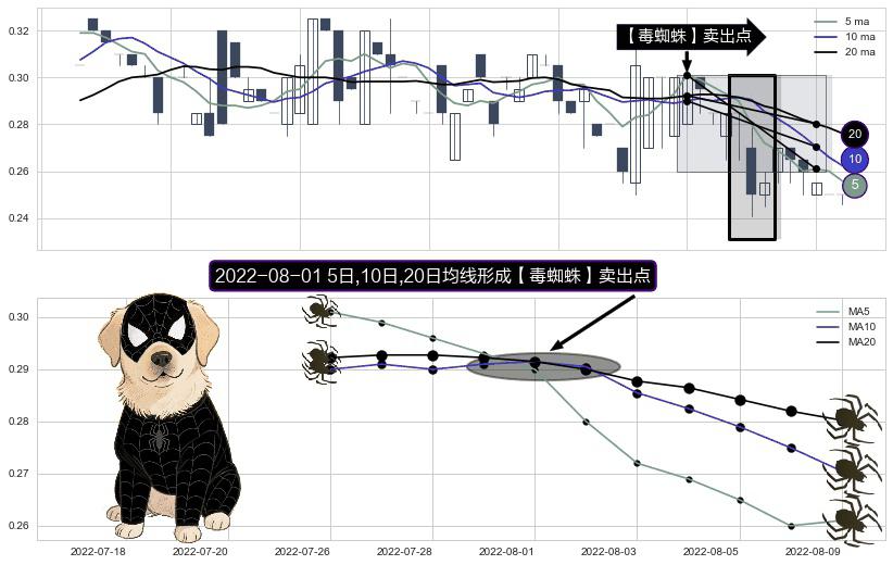 ⚀ 2022-08-01日显现 5日-10日-20日均线 【毒蜘蛛】卖出点 看空信号,后市看跌,卖出