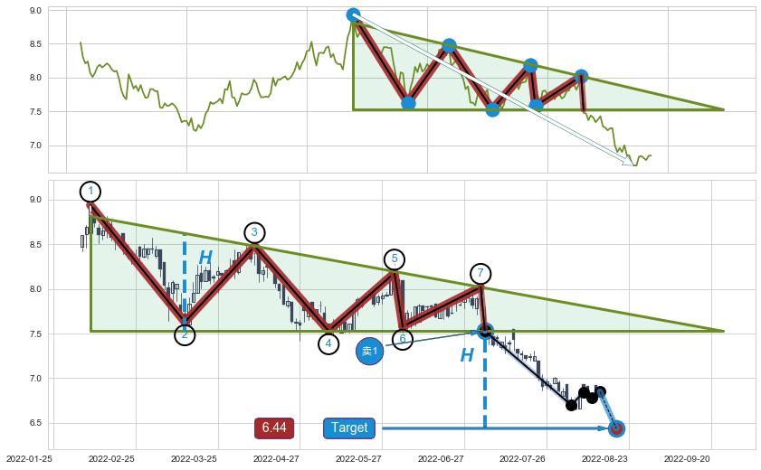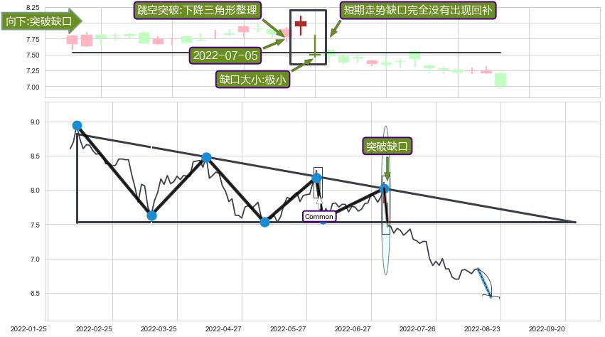 ➢ 【多方力量耗尽,空方打破攻守平衡点】下降三角形中继整理, 已在2022-07-05突破【支撑】颈线 7.53 →演变成下降通道