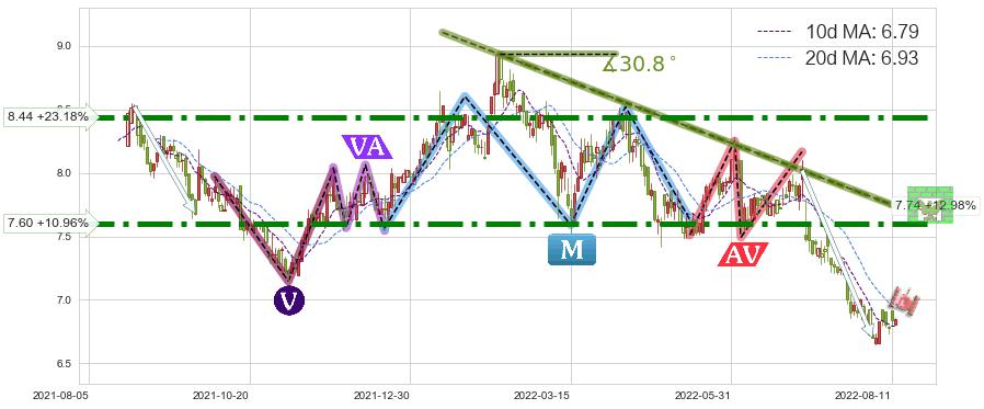 ➢ 【已确认突破】最后价格:6.85与最小【整理】第一目标价格→(2022-08-18: 6.44 )相较: 下跌空间【中等】