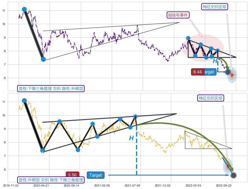 | 4 🅚:下跌抵抗 ➕ 📐:下降三角整理下行突破支撑位破位, 猜想持续下沉下跌,被突破的支撑位已变为阻力位 ☞ 看空信号 ⇥ 【🅚线】交织【图形】⇥ 综合量化分数: 46 | > |
