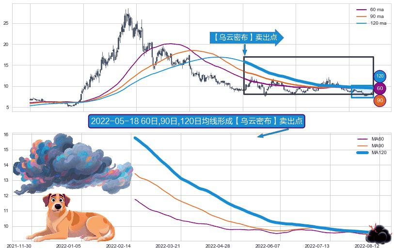 ⚀ 2022-02-16日-2022-08-12日显现 60日-90日-120日均线 【乌云密布】卖出点 看空信号,后市看跌,卖出