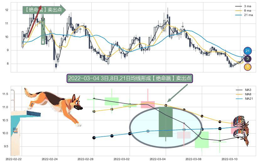 ⚀ 2022-03-04日显现 3日-8日-21日均线 【绝命跳】卖出点 看空信号,后市看跌,卖出